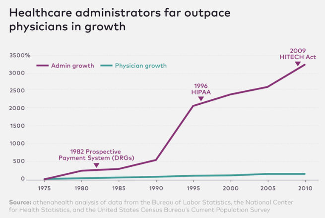 I worked for over 7 years in the fiat healthcare system and learned a great deal about the brokenness of our current system. When I started strategy consulting for hospitals and health systems, I had the opportunity to see how centralizing forces within healthcare were impacting decisions for vertical integration and mergers across broad geographic areas. As I started navigating and understanding the complex web of players, I started to see how the industry was filled with "administrators" who handled the tasks outside of clinical responsibilities. One symptom of healthcare on a fiat standard has been the outrageous 3000%+ growth of administrators, while the number of physicians has stayed relatively flat.