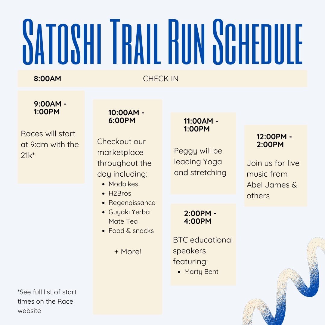 The event will take place at the Hippo Social Club in Hutto starting with the trail run in the morning, and is presented in partnership the Austin Bitcoin Club, Bitcoin Commons, Round Rock Bitcoin Club, University of Texas Longhorn Club and the San Antonio Bitcoin Club.